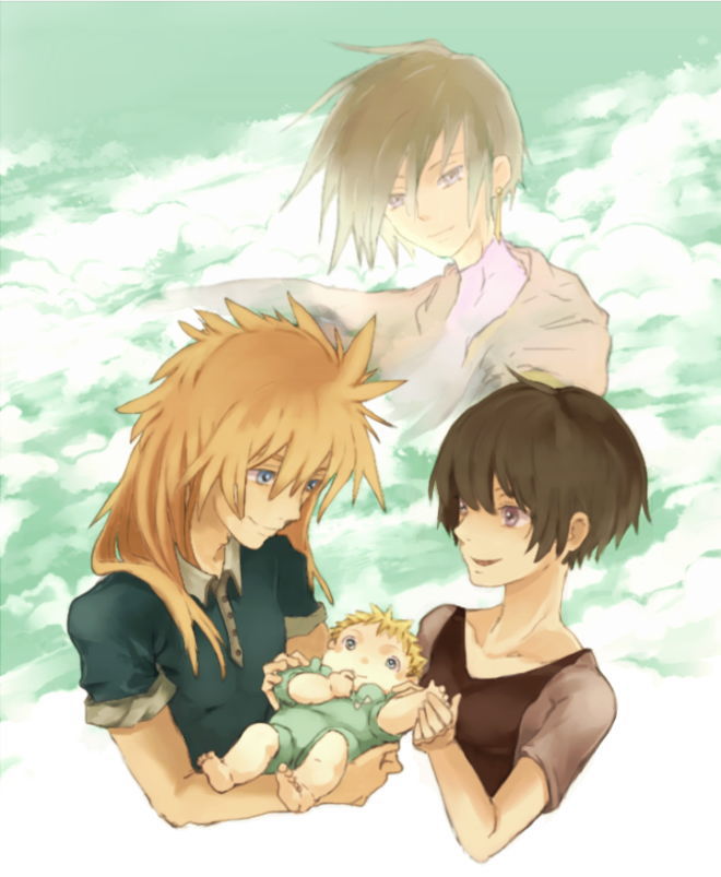 赤ちゃんカイルを抱くスタンとルーティ、それを見守るリオン